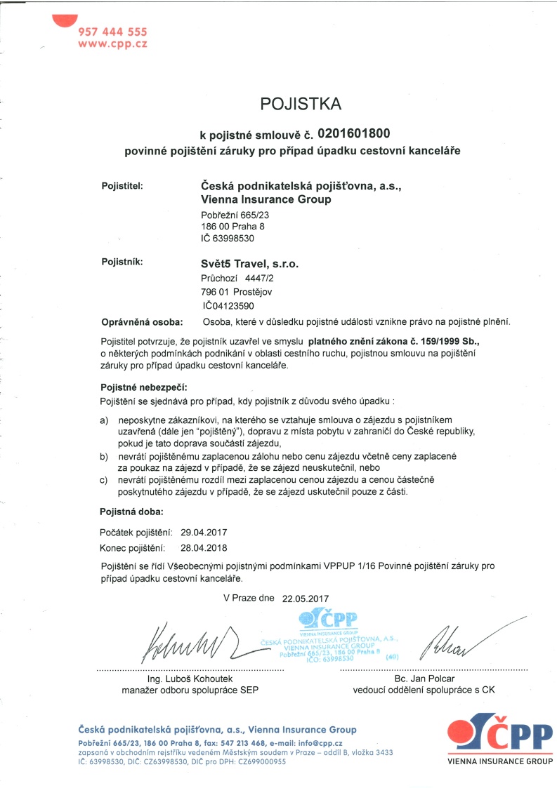 Cestovní kancelář Svět5 Travel, s. r. o. je pojištěna pro případ úpadku ve smyslu zákona č. 159/1999 Sb. u České podnikatelské pojišťovny, a. s., číslo pojistné smlouvy je 0201601800.